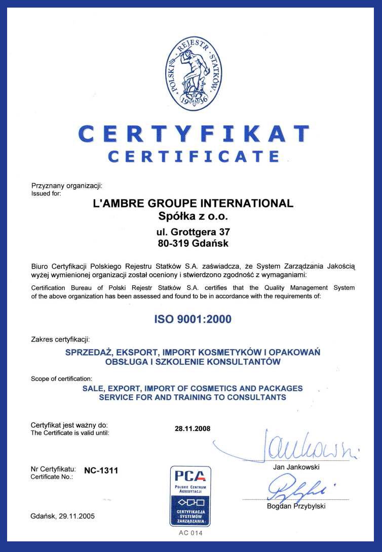 Вся парфюмерная продукция проходит тестирование в автономной некоммерческой организации «Парфюмтест» и соответствует нормам и требованиям к концентрации душистых веществ. Для продолжения работы на международном рынке компания L’AMBRE Groupe International получила сертификат №NC–1311, подтверждающий осуществление деятельности по разработке и внедрению систем менеджмента качества ISO 9001:2000 в области продажи, экспорта, импорта косметики и упаковки, а также обслуживания и обучения консультантов.ÂÂÂ